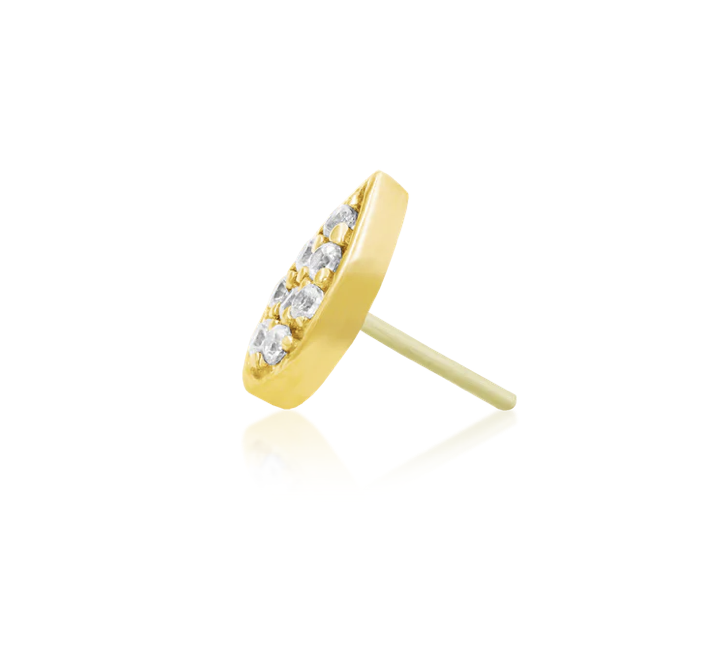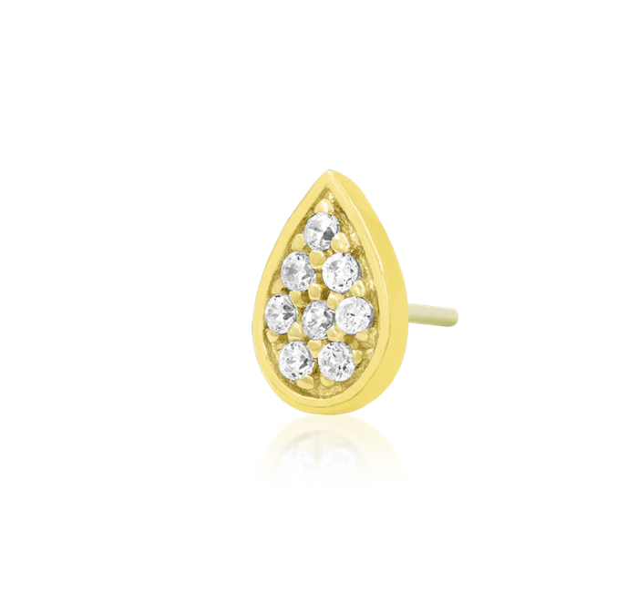 The Gold pear piece features eight 1mm CZs in a gold pear. This pieces measures 4.25mm x 6mm. Beautiful intricate detailing accents the gemstones. This threadless decorative end is available in 14 karat Yellow Gold.