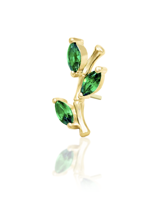 This 4.4mm x 9.3mm solid 3D sculpted gold bamboo shoot, completed with a trio of 1.5x3mm green marquise CZ.  It is available in 14k Yellow Gold.